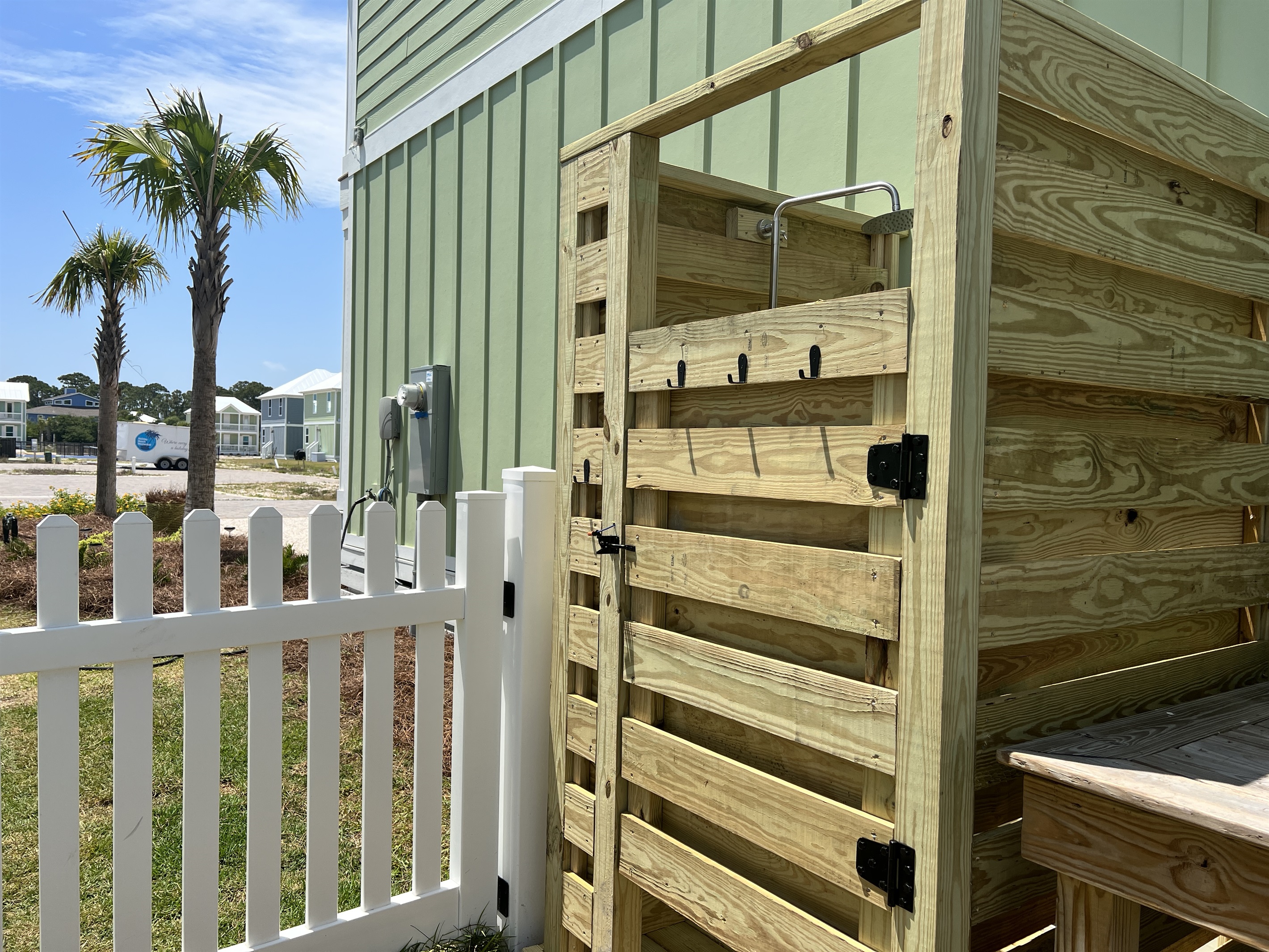 🚿 Enclosed outdoor shower with hot/cold water + hooks for towels/swimsuits.